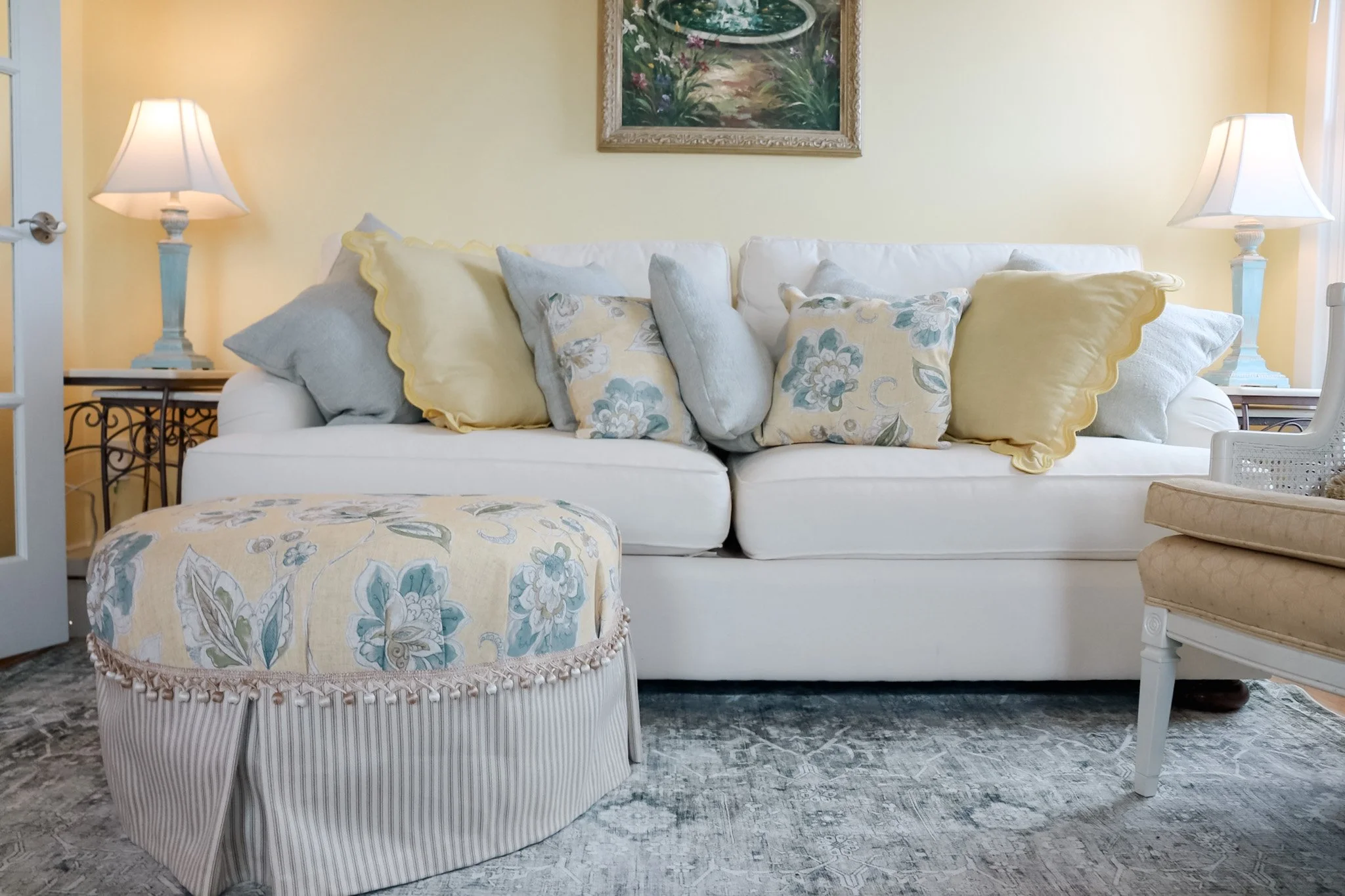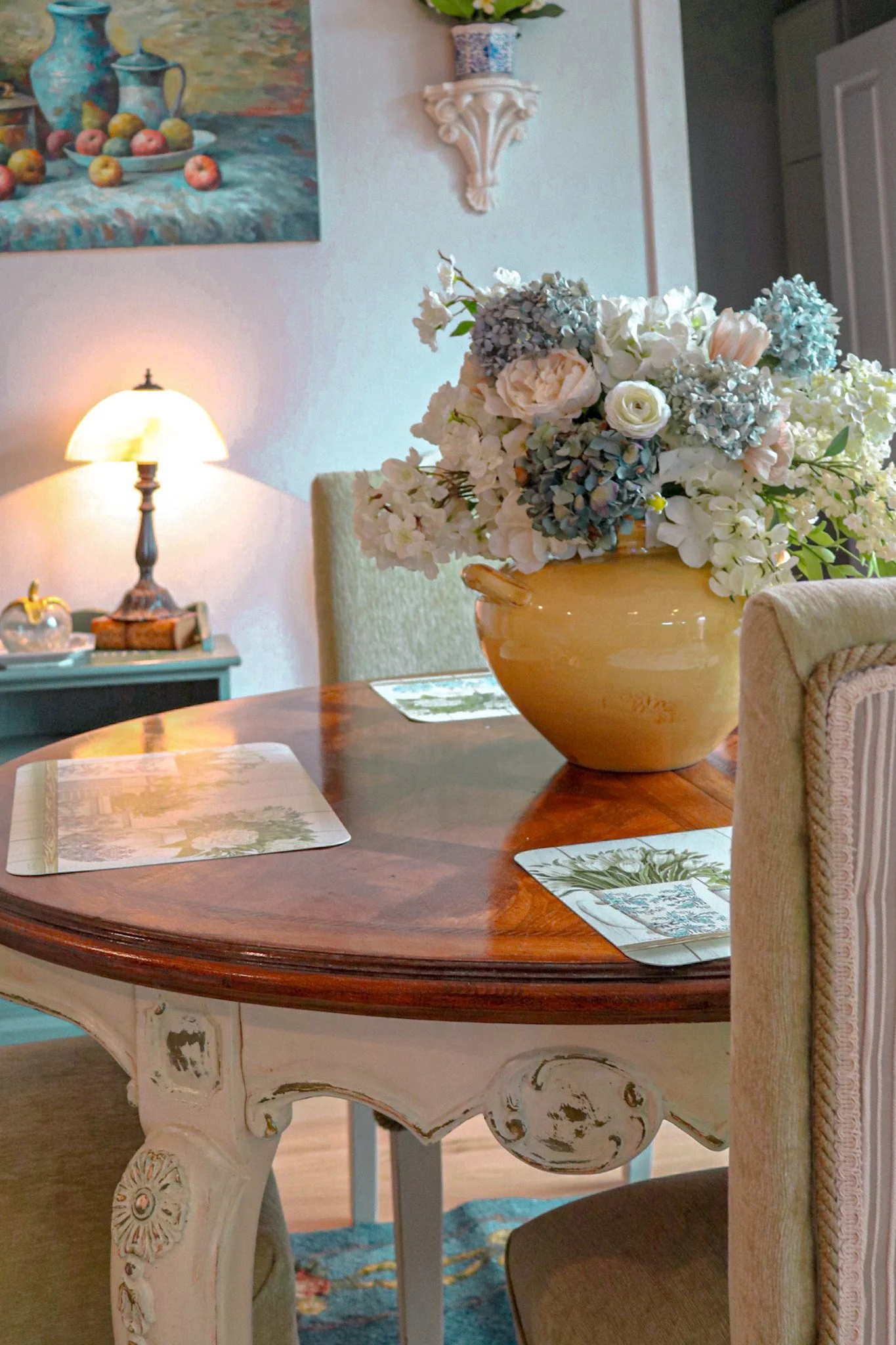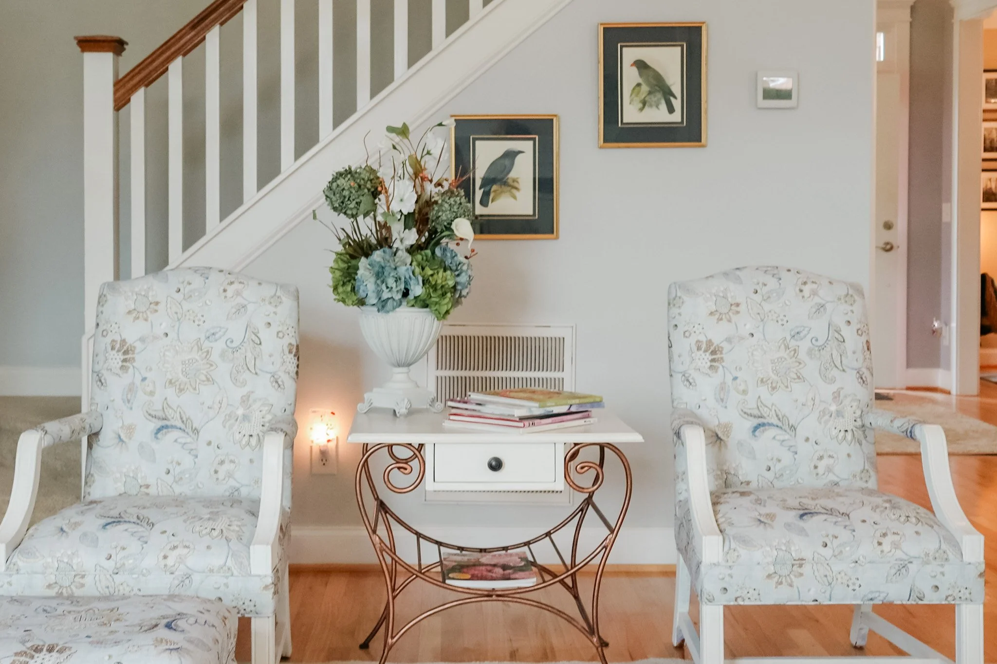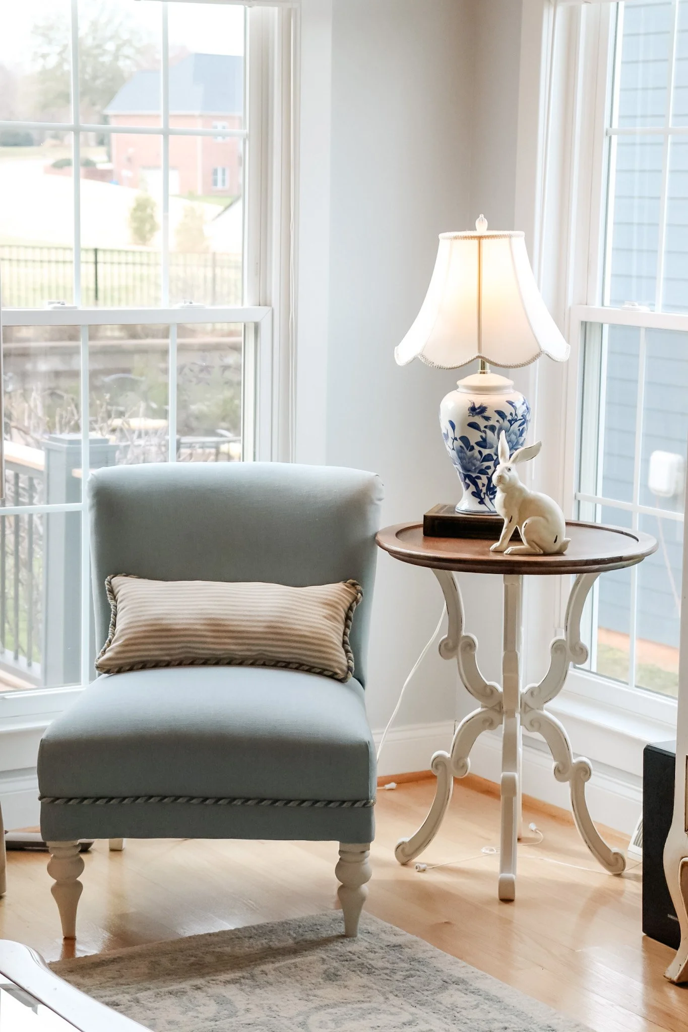 The living room embraces a French country aesthetic with a distinctly serene, “zen” presence. Soft light blue tones set a calming foundation, while romantic florals introduce a feminine, restorative warmth. Elegant furniture curves bring softness and flow, and touches of the homeowner’s beloved blue-and-white patterns are woven throughout — personal, familiar, and grounding.