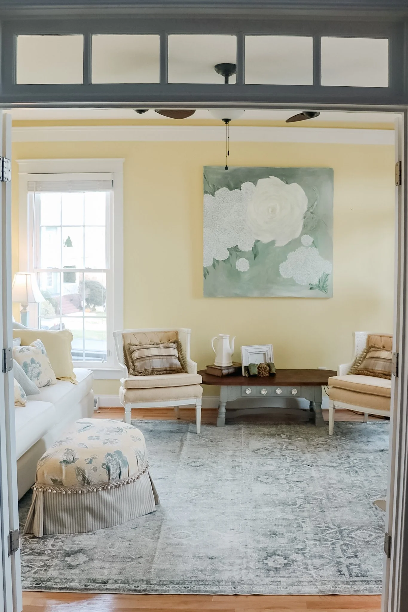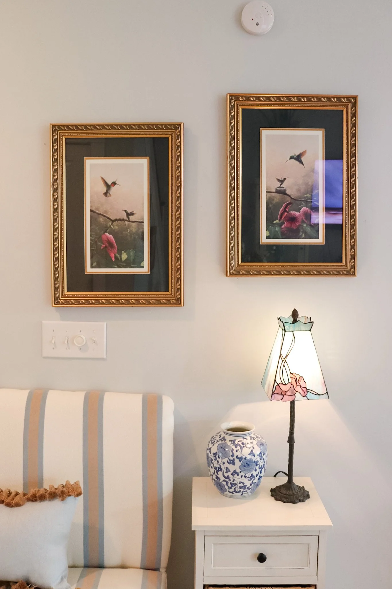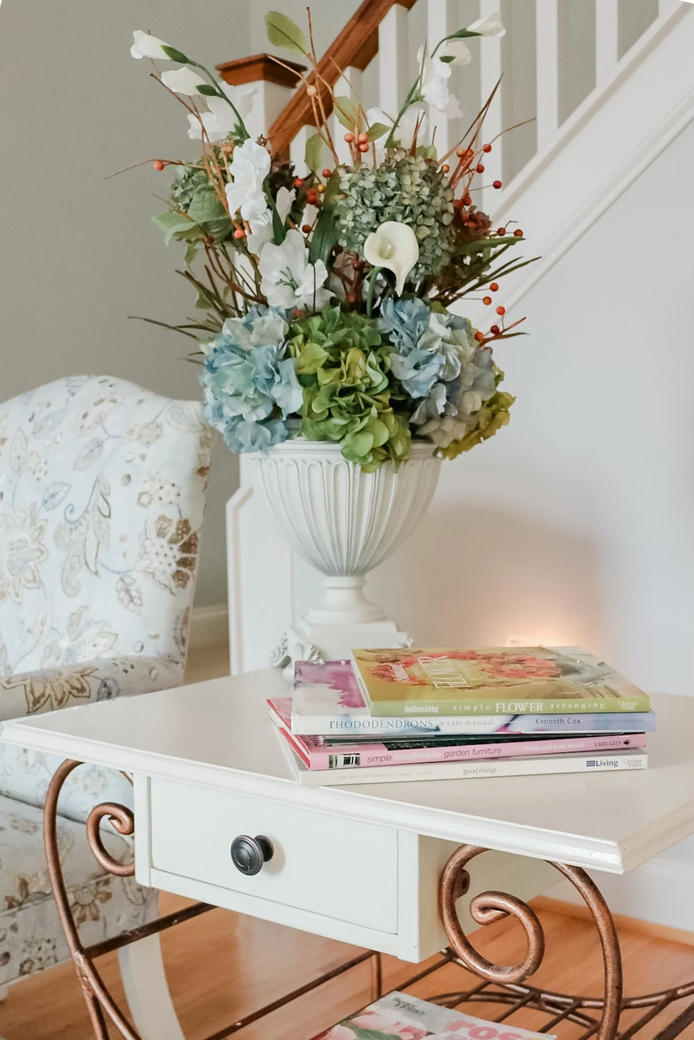 The living room embraces a French country aesthetic with a distinctly serene, “zen” presence. Soft light blue tones set a calming foundation, while romantic florals introduce a feminine, restorative warmth. Elegant furniture curves bring softness and flow, and touches of the homeowner’s beloved blue-and-white patterns are woven throughout — personal, familiar, and grounding.