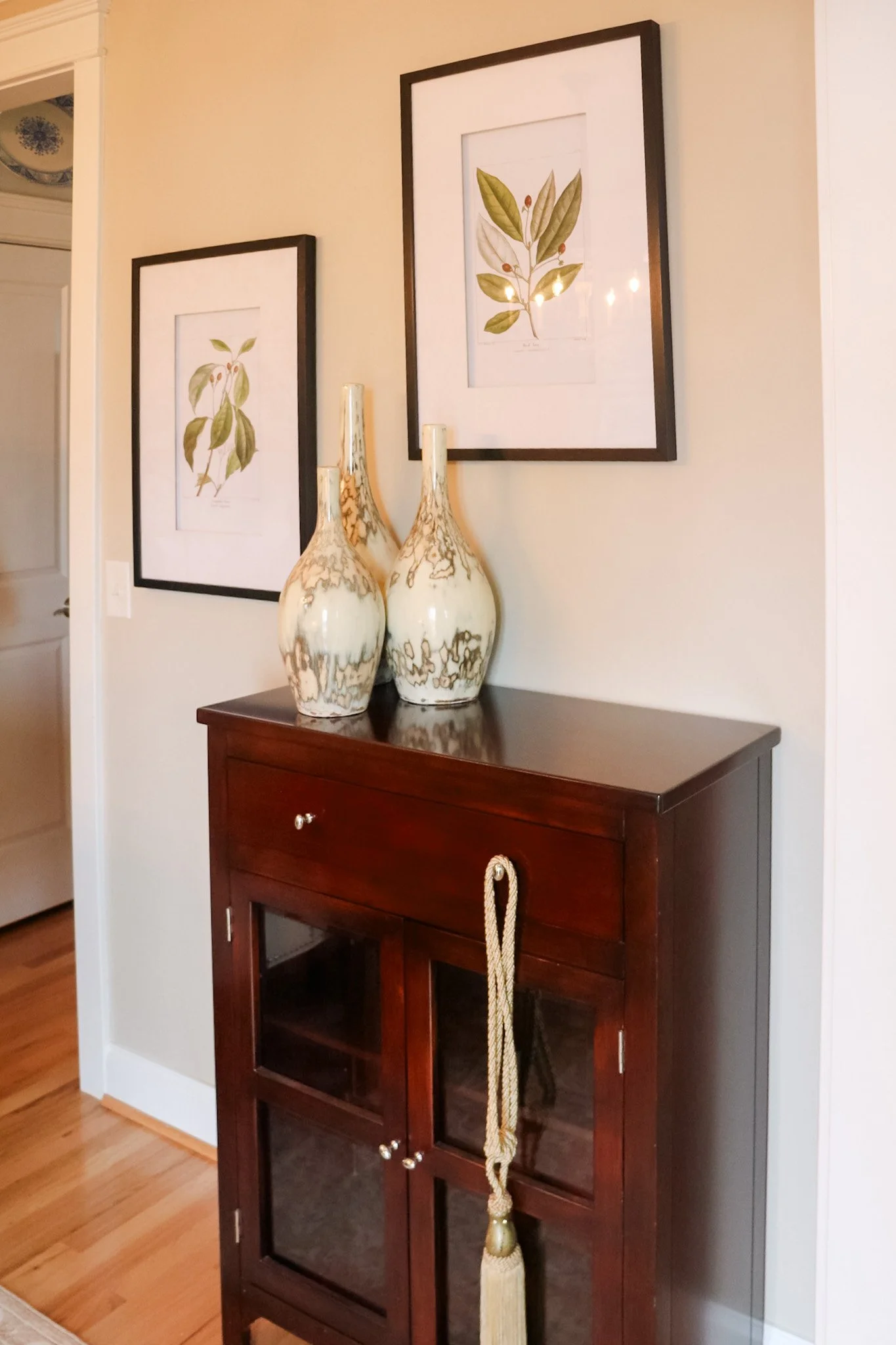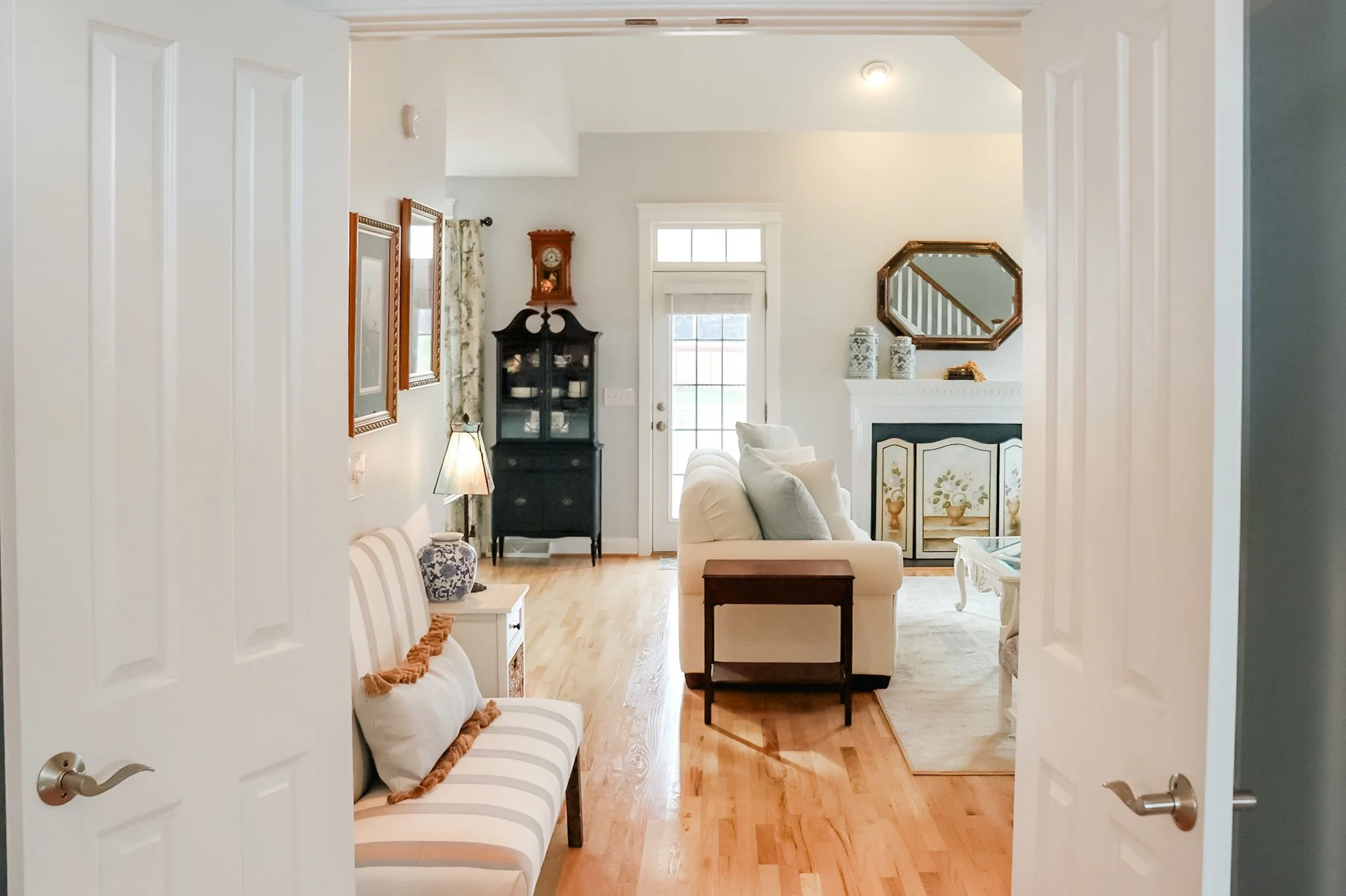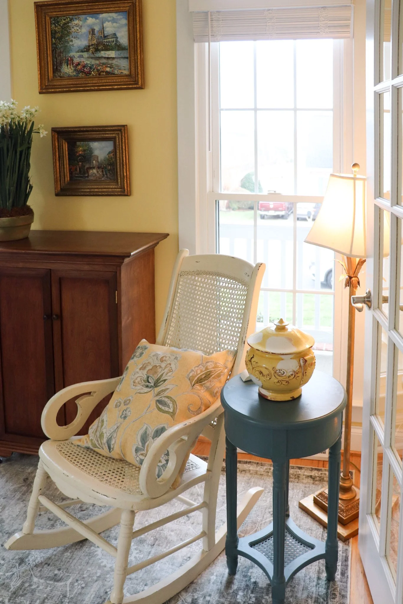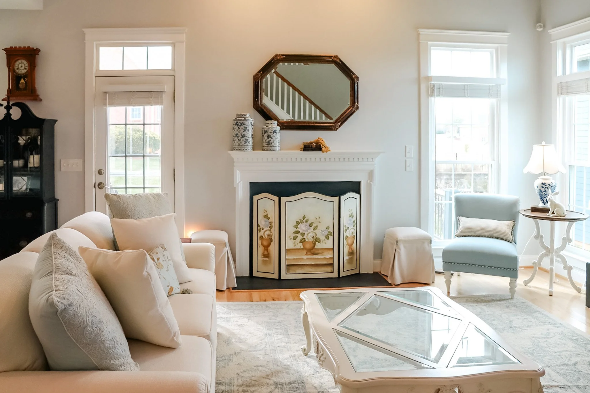 The living room embraces a French country aesthetic with a distinctly serene, “zen” presence. Soft light blue tones set a calming foundation, while romantic florals introduce a feminine, restorative warmth. Elegant furniture curves bring softness and flow, and touches of the homeowner’s beloved blue-and-white patterns are woven throughout — personal, familiar, and grounding.
