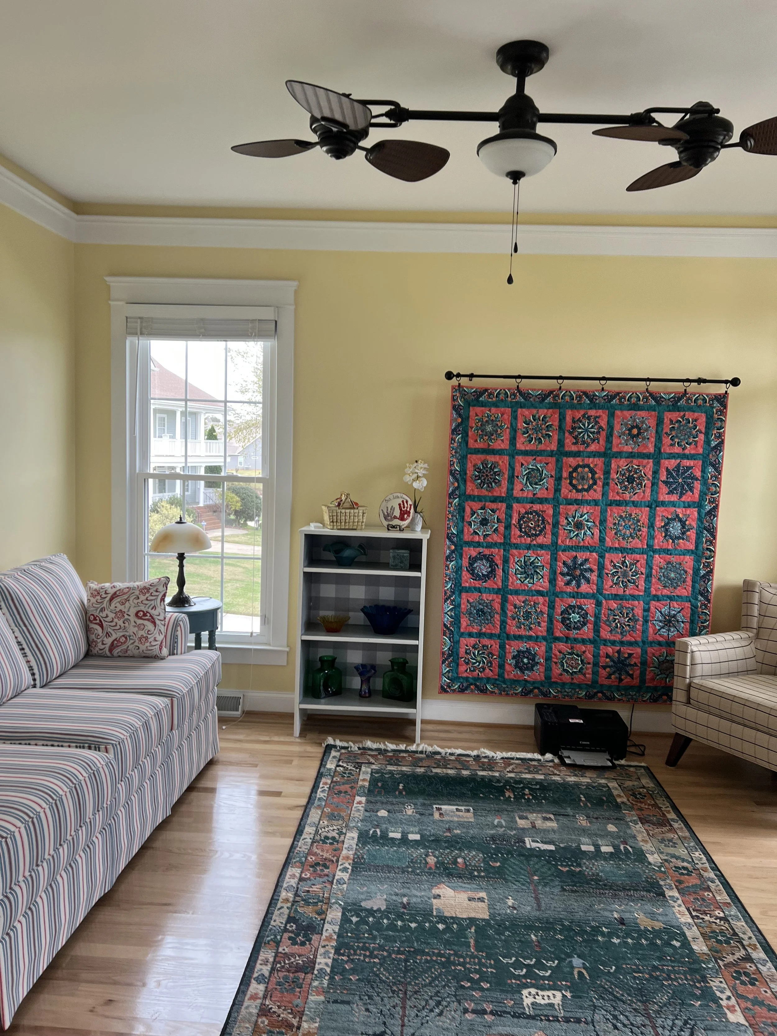 The traditional green-and-cream floral print captures the warmth of morning light, subtly echoing the sunrise glow of the nearby reading space. This visual continuity allows each room to flow effortlessly into the next, creating a cohesive and intentional experience throughout the home.