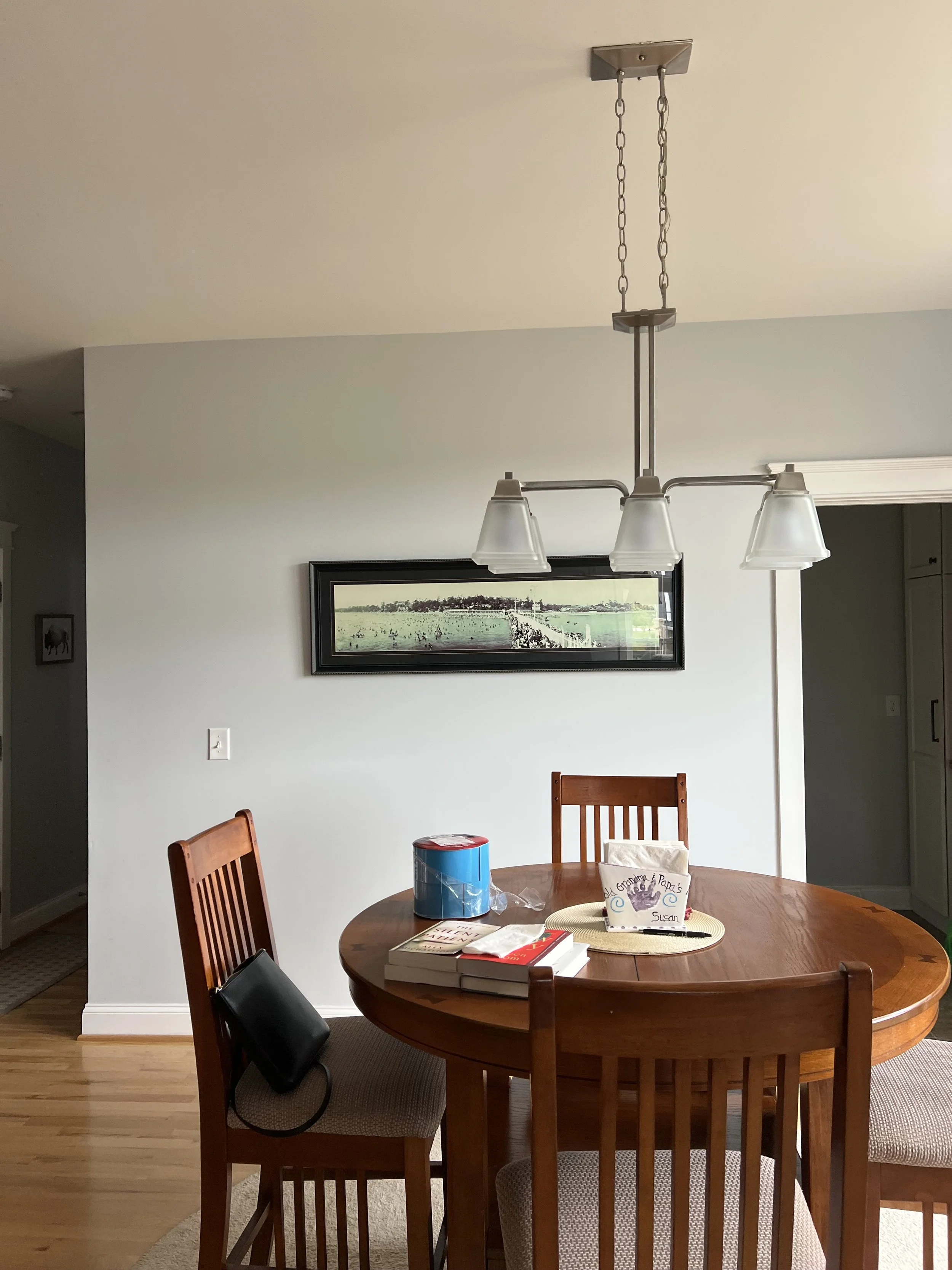 The dining room was designed to feel welcoming and refined, harmonizing seamlessly with the calm atmosphere of the adjacent living space. A wallpapered accent wall became the anchor of the room, setting the tone for every surrounding detail.